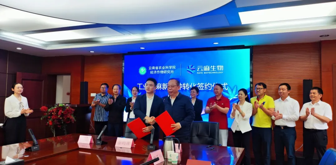 在签约仪式上,云南麻叶生物科技有限公司总经理伍鹏先生与云南省农业科学院经济作物研究所所长李根泽研究员签署了工业大麻新品种转化合作协议,同时,云南省农业科学院经济作物研究所向云南麻叶生物科技有限公司独家授予了“云麻雌1号”品种授权书,意味着双方将通过强强联合,优势互补,共同开展新品种的繁育、推广和产业化应用,推动云南工业大麻产业的高质量市场化发展。